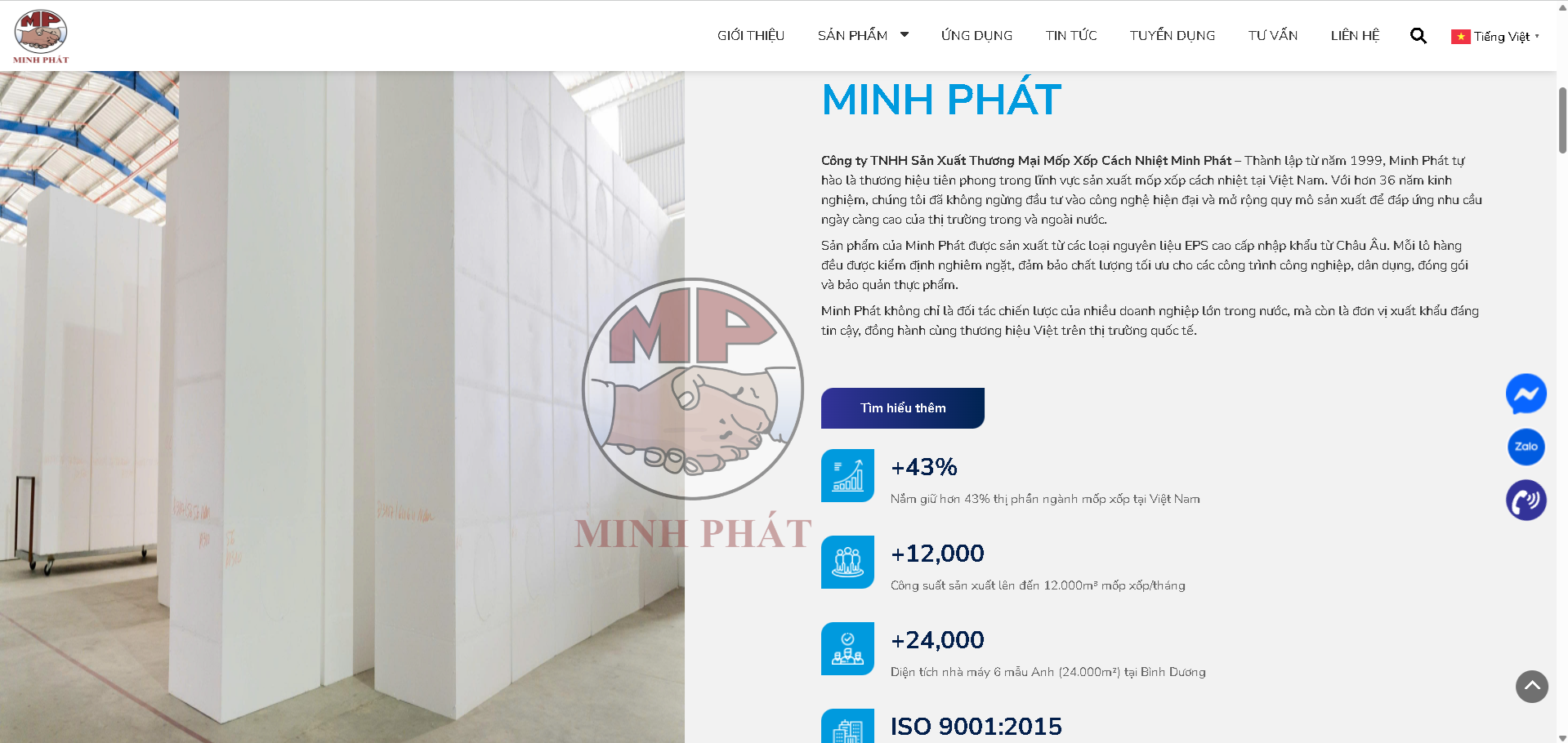Minh Phát là doanh nghiệp sản xuất mốp xốp cách nhiệt tại Việt Nam, thành lập từ năm 1999, với nhiều năm kinh nghiệm trong ngành EPS, PS. Sản phẩm được sản xuất từ nguyên liệu cao cấp nhập khẩu Châu Âu, kiểm định nghiêm ngặt, đáp ứng tiêu chuẩn cho xây dựng, công nghiệp và đóng gói. Minh Phát là đối tác tin cậy của nhiều doanh nghiệp lớn trong nước và xuất khẩu ổn định ra thị trường quốc tế.