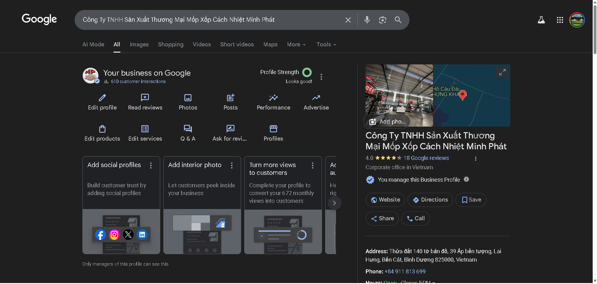 Về mặt kỹ thuật, Mahaton xây dựng và duy trì hệ thống vận hành số cho Minh Phát xoay quanh Google Business Profile và nền tảng tìm kiếm địa phương. Chúng tôi chuẩn hóa toàn bộ hồ sơ Google Maps, cấu trúc thông tin doanh nghiệp, danh mục dịch vụ, khu vực phục vụ và hình ảnh nhà xưởng nhằm đảm bảo khả năng hiển thị ổn định và chính xác. Đồng thời, Mahaton triển khai quy trình quản lý và duy trì đánh giá khách hàng, giúp Minh Phát giữ xếp hạng 4 sao trở lên một cách bền vững, tăng độ tin cậy và tỷ lệ chuyển đổi từ tìm kiếm địa phương. Hệ thống được theo dõi và tối ưu liên tục để duy trì hiệu suất hiển thị, mức độ tương tác và uy tín thương hiệu lâu dài trên Google.